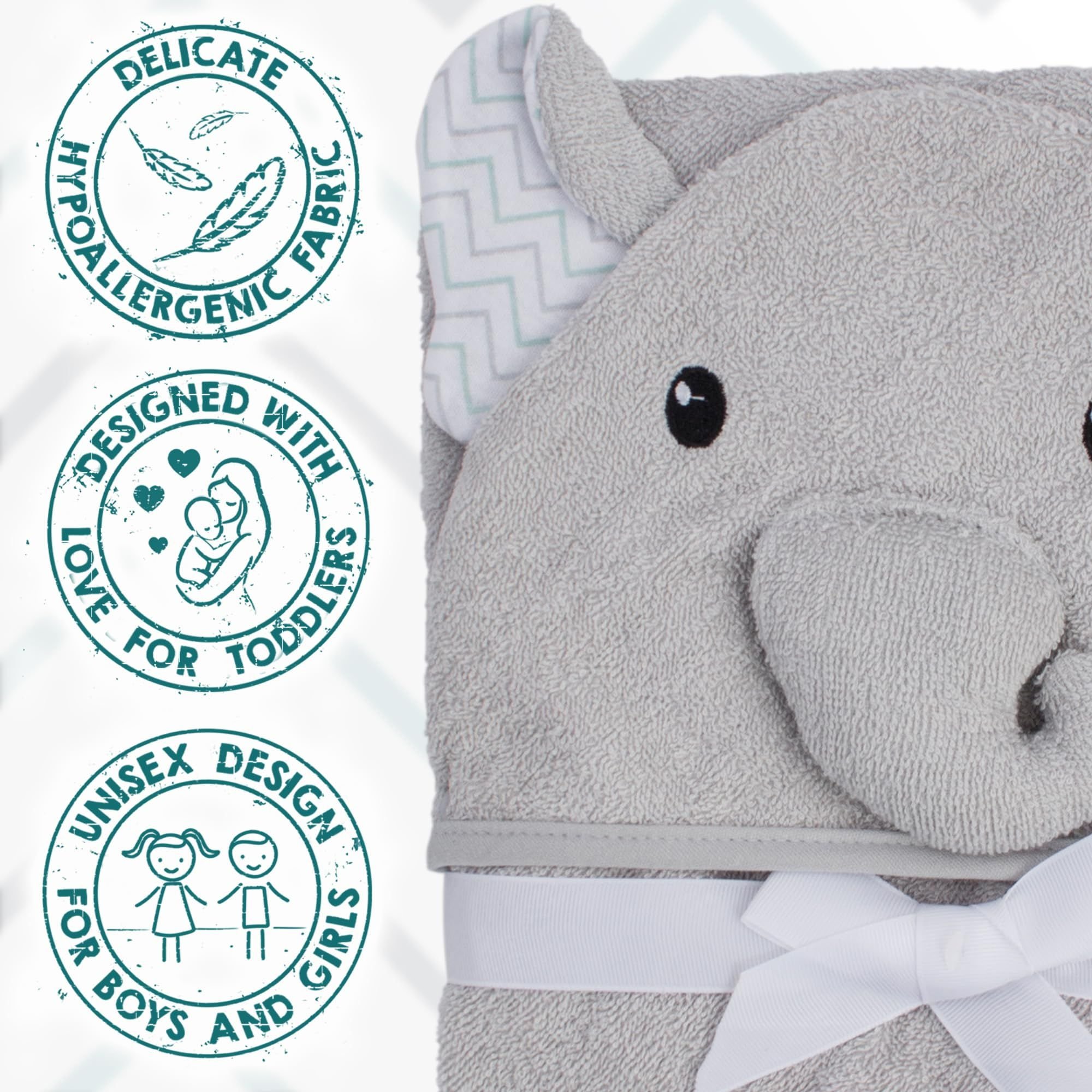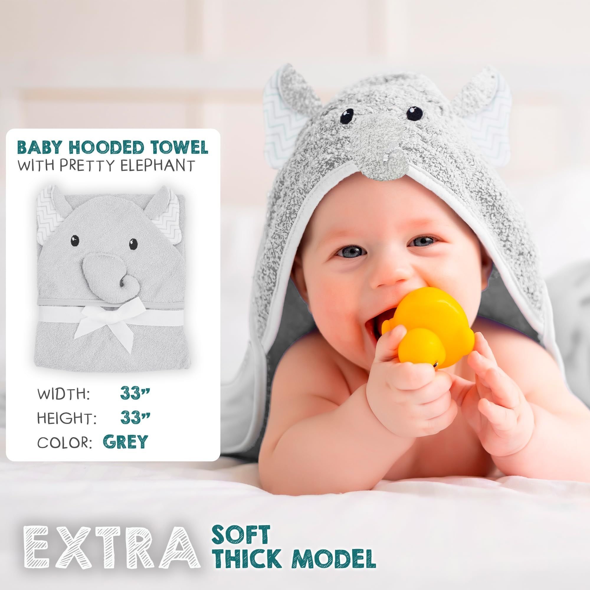 1.Light Gray Elephant Baby Hooded Towels 33 x 33 inch. High-quality 100% woven terry cotton baby towels with hood make the perfect shower gift. Hooded bath towels for babies are adorable, with a cute elephant face and ears design that every new parent will love!