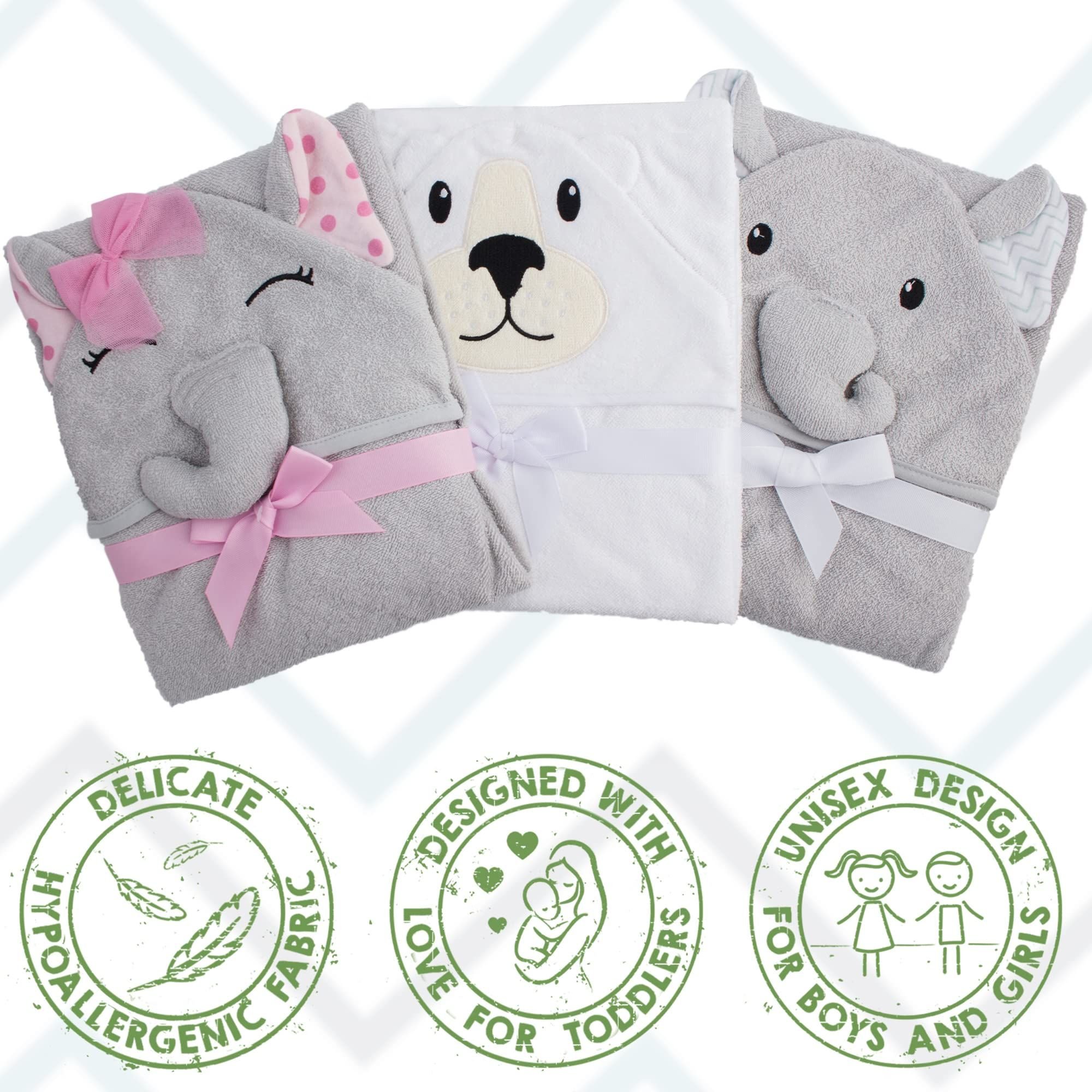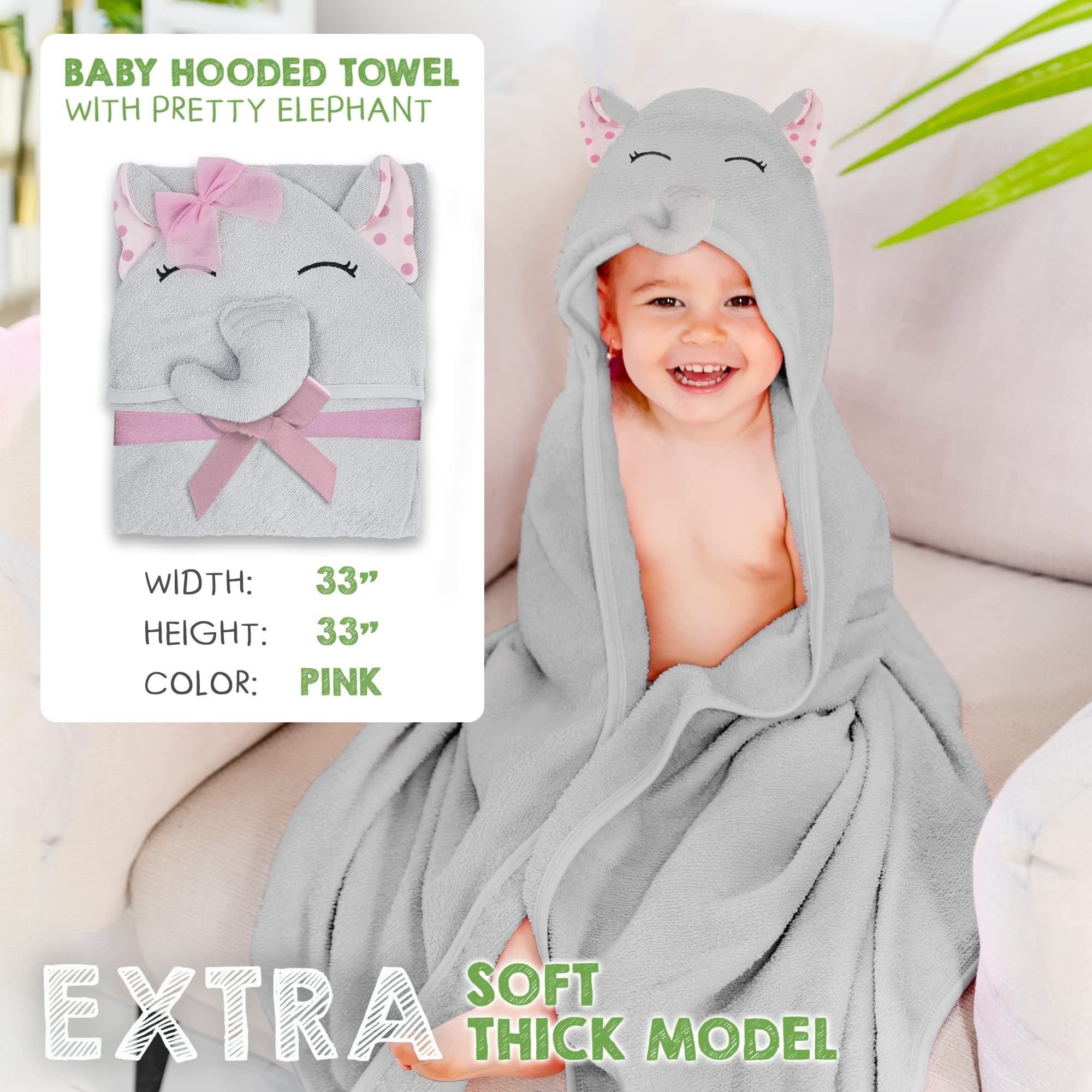 1.Pink Elephant Baby Hooded Towels 33 x 33 inch. High-quality 100% woven terry cotton baby towels with hood make the perfect shower gift. Hooded bath towels for babies are adorable, with a cute elephant face and ears design that every new parent will love!