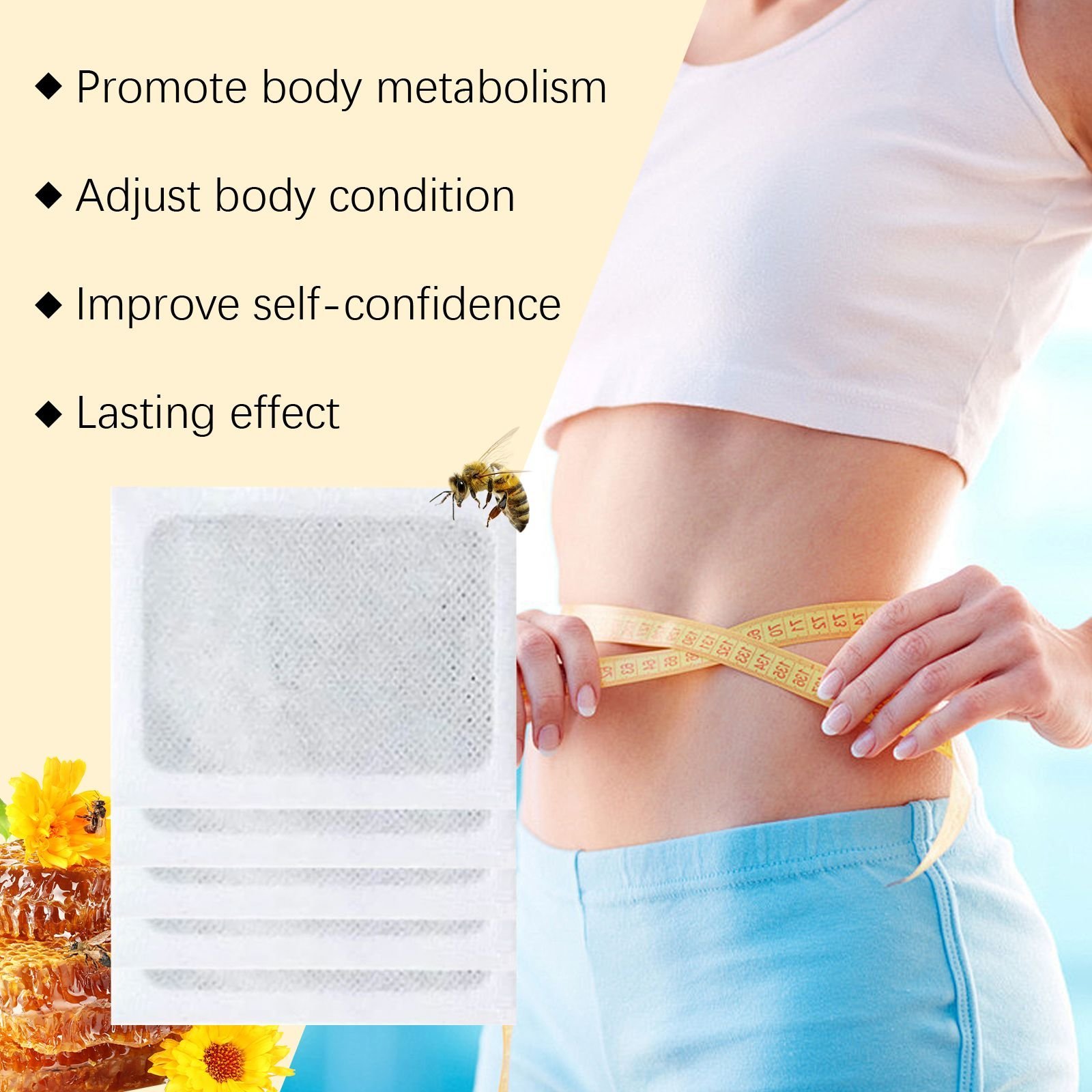 Our body care pads contain bee venom, turmeric root extract, mint leaf extract. It can promote collagen production and improve skin elasticity. Gently soothes and helps reduce skin discomfort. Can enhance fat decomposition, accelerate fat metabolism, help lose fat. Its use method is very simple: 1. Wash your feet and keep your feet dry. 2. Remove the patch and attach it to your foot, pressing gently to ensure adhesion. 3. Wait 6-8 hours and then remove the patch. Use active ingredients to effectively accelerate your body's metabolism. Easy to carry, suitable for business trips. Easy to operate, easy to apply anytime, anywhere. Helps to adjust the body condition and increase vitality.
